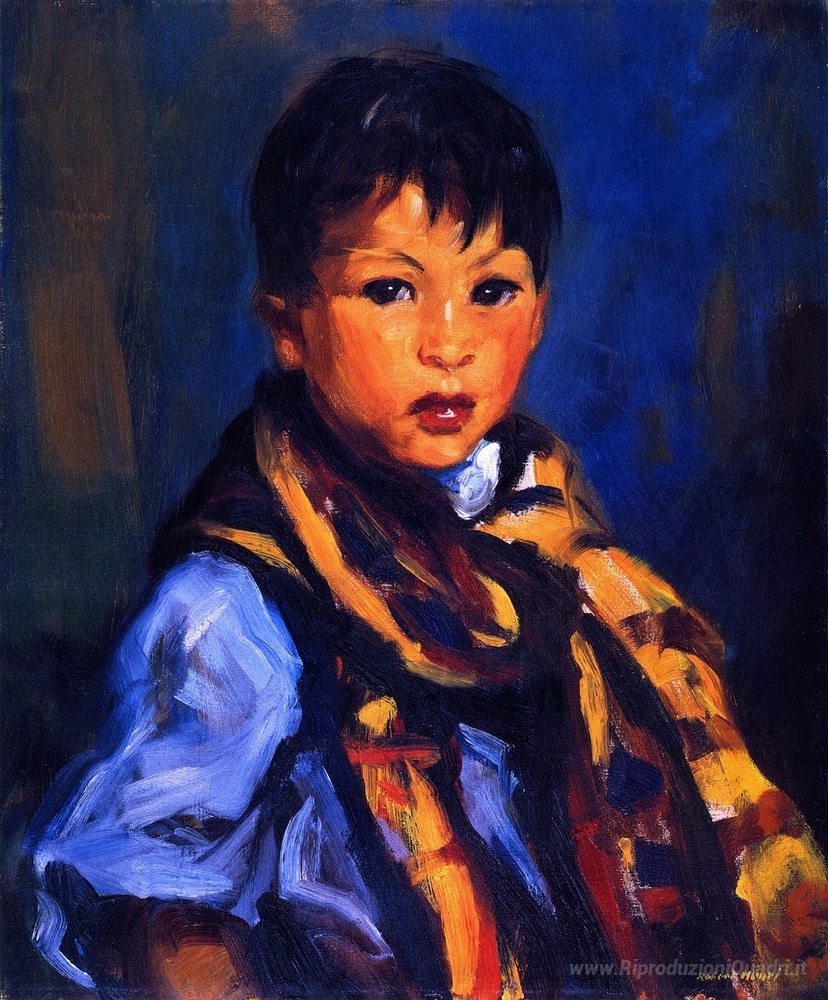 Ti offriamo una riproduzione artigianale su tela dell'opera famosa 'Ragazzo con Plaid Scarf' di Robert Henri, dal Museo delle Riproduzioni.