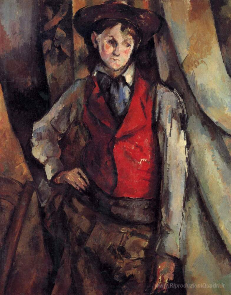 Ti offriamo una riproduzione artigianale su tela dell'opera famosa 'Ragazzo in un giubbotto rosso' di Paul Cezanne, dal Museo delle Riproduzioni.