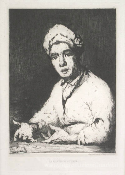 Ti offriamo una riproduzione artigianale su tela dell'opera famosa 'Ricetta del cuoco' di Theodule Ribot, dal Museo delle Riproduzioni.