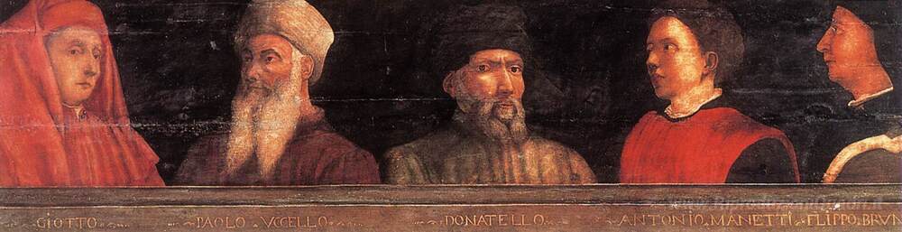 Ti offriamo una riproduzione artigianale su tela dell'opera famosa 'Ritratti di Giotto, Paolo Uccello, Donatello, Manetti e Bruno' di Paolo Uccello, dal Museo delle Riproduzioni.