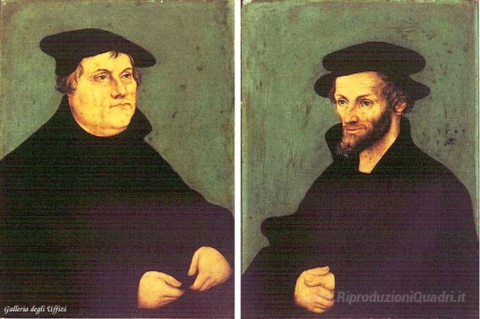 Ti offriamo una riproduzione artigianale su tela dell'opera famosa 'Ritratti di Martin Lutero e Filippo Melantone' di Lucas Cranach the Elder, dal Museo delle Riproduzioni.