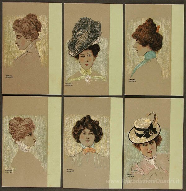 Ti offriamo una riproduzione artigianale su tela dell'opera famosa 'Ritratti di signore di Vienna' di Raphael Kirchner, dal Museo delle Riproduzioni.