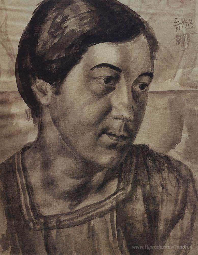 Ti offriamo una riproduzione artigianale su tela dell'opera famosa 'Ritratto della moglie dell'artista' di Kuzma Petrov-Vodkin, dal Museo delle Riproduzioni.