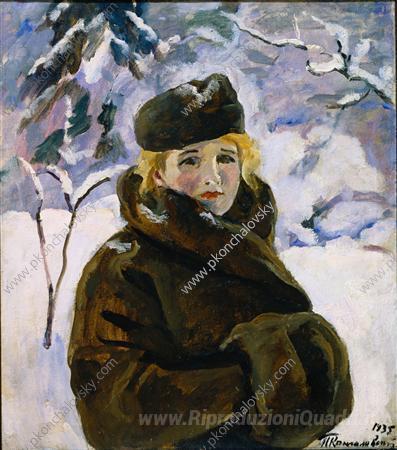 Ti offriamo una riproduzione artigianale su tela dell'opera famosa 'Ritratto di Anna Kondratyevna Reyhshtadt sullo sfondo di un paes' di Pyotr Konchalovsky, dal Museo delle Riproduzioni.