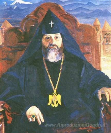 Ti offriamo una riproduzione artigianale su tela dell'opera famosa 'Ritratto di Catholicos di tutti gli Armeni Vazgen I' di Martiros Saryan, dal Museo delle Riproduzioni.