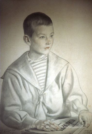 Ti offriamo una riproduzione artigianale su tela dell'opera famosa 'Ritratto di Dmitri Dmitrievich Shostakovich come un bambino' di Boris Kustodiev, dal Museo delle Riproduzioni.