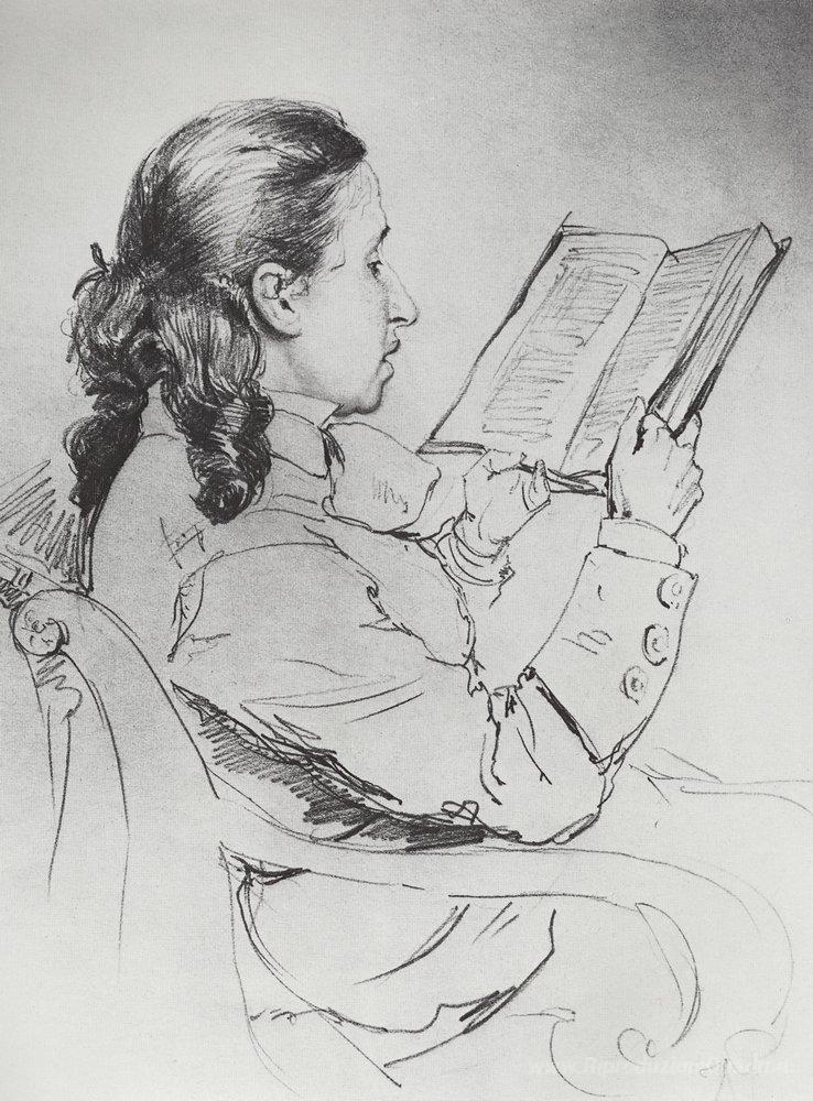 Ti offriamo una riproduzione artigianale su tela dell'opera famosa 'Ritratto di E.G. Mamontova lettura' di Ilya Repin, dal Museo delle Riproduzioni.
