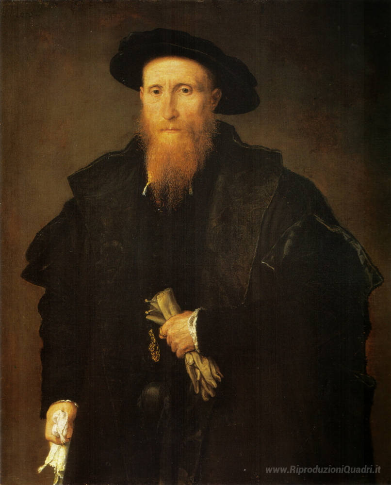 Ti offriamo una riproduzione artigianale su tela dell'opera famosa 'Ritratto di gentiluomo con guanti' di Lorenzo Lotto, dal Museo delle Riproduzioni.