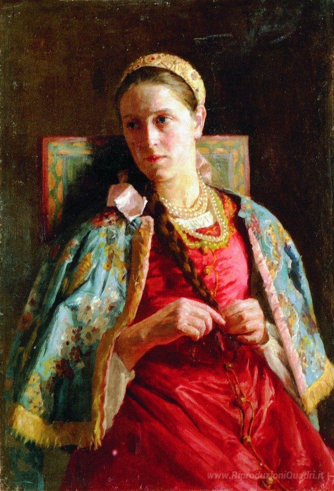 Ti offriamo una riproduzione artigianale su tela dell'opera famosa 'Ritratto di giovane signora in costume russo' di Konstantin Makovsky, dal Museo delle Riproduzioni.
