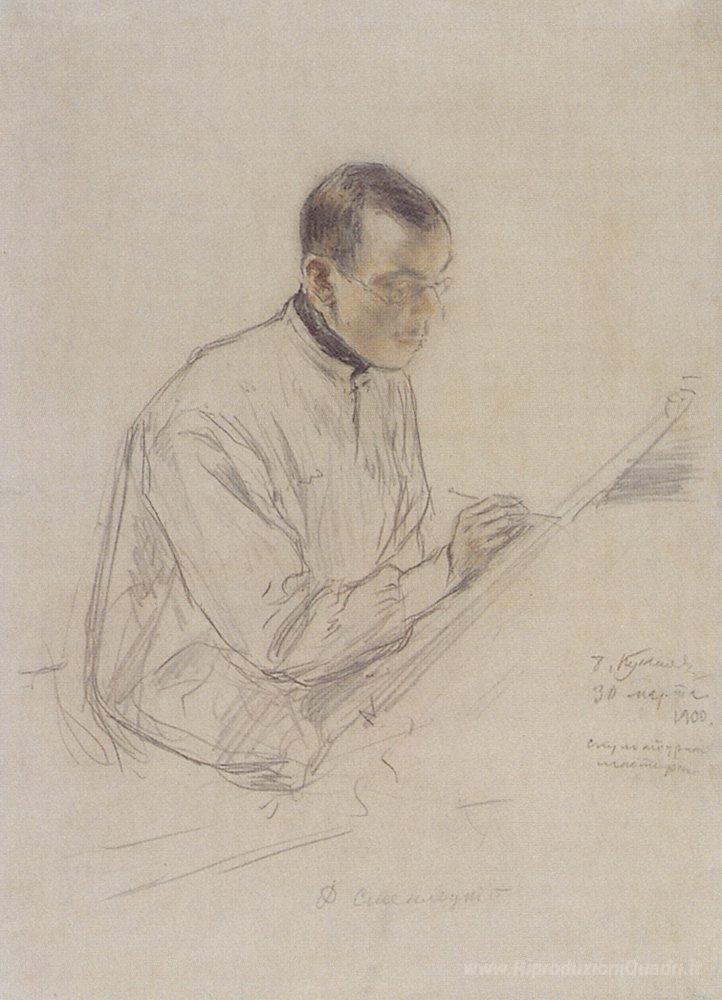 Ti offriamo una riproduzione artigianale su tela dell'opera famosa 'Ritratto di G.S. Stelletsky al lavoro' di Boris Kustodiev, dal Museo delle Riproduzioni.