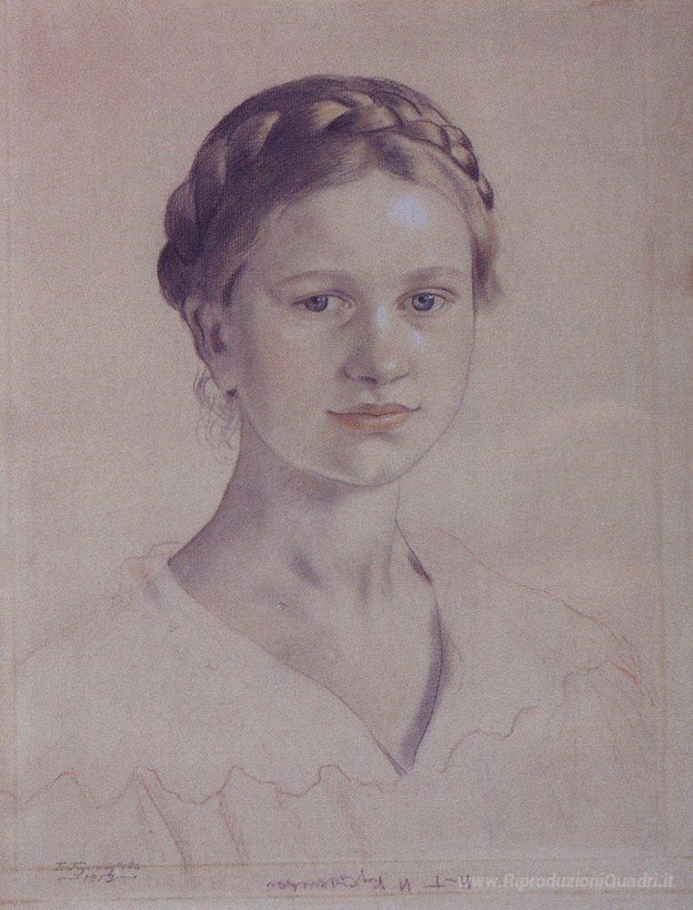 Ti offriamo una riproduzione artigianale su tela dell'opera famosa 'Ritratto di I.B. Kustodieva, figlia dell'artista' di Boris Kustodiev, dal Museo delle Riproduzioni.