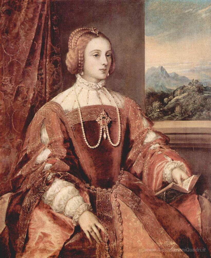 Ti offriamo una riproduzione artigianale su tela dell'opera famosa 'Ritratto di Isabella di Portogallo, moglie di Sacro Romano Imper' di Titian, dal Museo delle Riproduzioni.