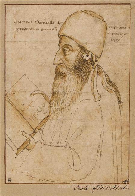 Ti offriamo una riproduzione artigianale su tela dell'opera famosa 'Ritratto di Manuel Crisolora indossa un cappello e in possesso d' di Paolo Uccello, dal Museo delle Riproduzioni.