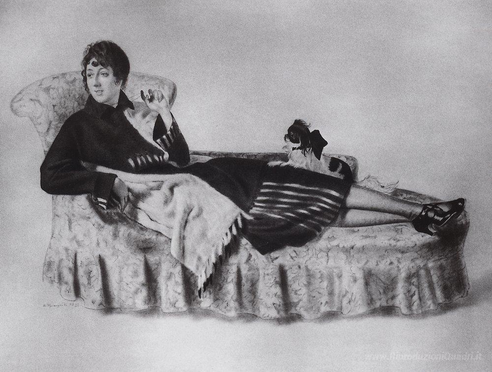 Ti offriamo una riproduzione artigianale su tela dell'opera famosa 'Ritratto di Maria Ryazantseva' di Boris Kustodiev, dal Museo delle Riproduzioni.