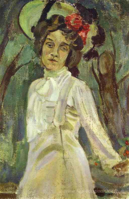Ti offriamo una riproduzione artigianale su tela dell'opera famosa 'Ritratto di Nadezhda Staniukovich' di Victor Borisov-Musatov, dal Museo delle Riproduzioni.