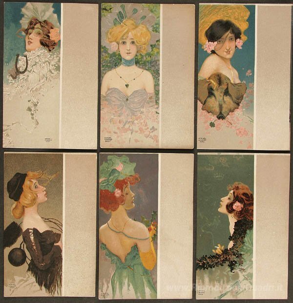 Ti offriamo una riproduzione artigianale su tela dell'opera famosa 'Ritratto di ragazze con bordo grigio' di Raphael Kirchner, dal Museo delle Riproduzioni.