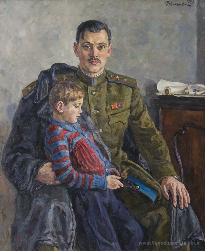 Ti offriamo una riproduzione artigianale su tela dell'opera famosa 'Ritratto di Sergei Vladimirovich Mikhalkov con il figlio' di Pyotr Konchalovsky, dal Museo delle Riproduzioni.