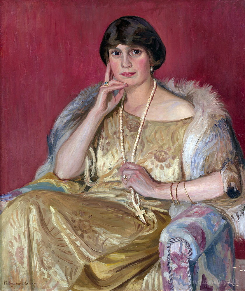Ti offriamo una riproduzione artigianale su tela dell'opera famosa 'Ritratto di signora' di Nikolay Bogdanov-Belsky, dal Museo delle Riproduzioni.