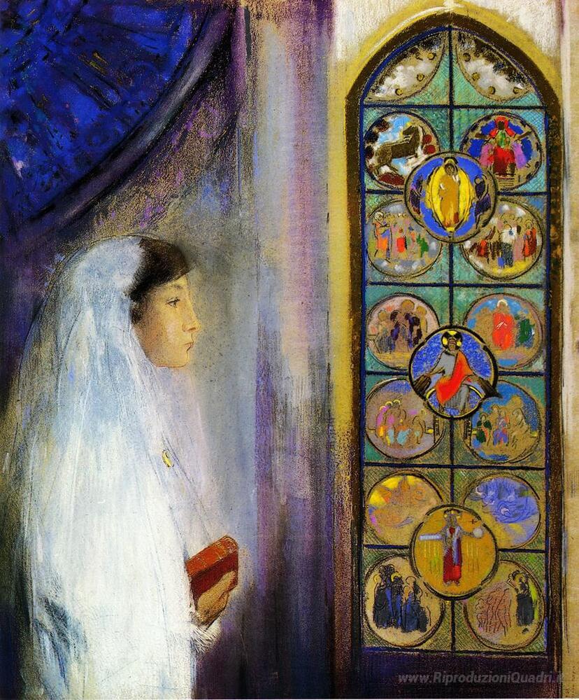Ti offriamo una riproduzione artigianale su tela dell'opera famosa 'Ritratto di Simone Fayet nella Santa Comunione' di Odilon Redon, dal Museo delle Riproduzioni.