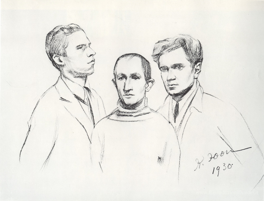 Ti offriamo una riproduzione artigianale su tela dell'opera famosa 'Ritratto di tre pittori (Kukriniksi). M.V. Kupriyanov, P.N. Kril' di Konstantin Yuon, dal Museo delle Riproduzioni.