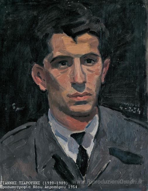 Ti offriamo una riproduzione artigianale su tela dell'opera famosa 'Ritratto di un giovane aviatore' di Yiannis Tsaroychis, dal Museo delle Riproduzioni.