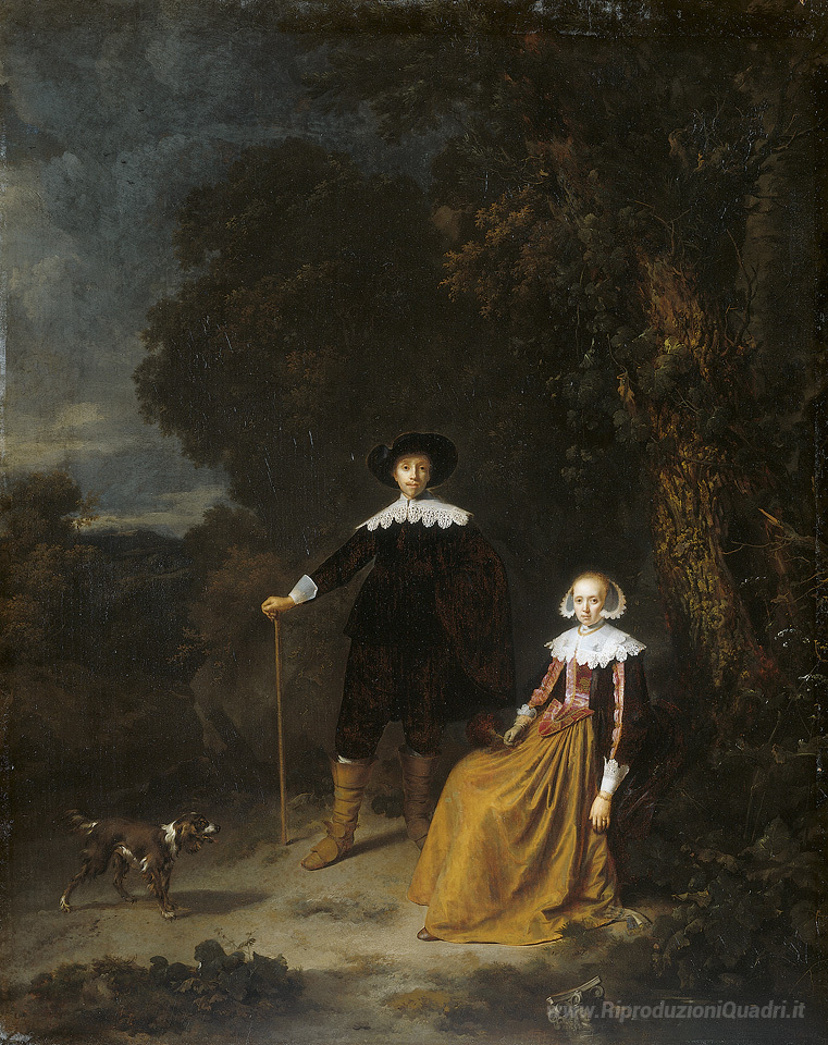 Ti offriamo una riproduzione artigianale su tela dell'opera famosa 'Ritratto di una coppia in un paesaggio' di Gerrit Dou, dal Museo delle Riproduzioni.