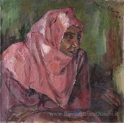 Ti offriamo una riproduzione artigianale su tela dell'opera famosa 'Ritratto di una donna che indossa un hijab Rosa' di Irma Stern, dal Museo delle Riproduzioni.