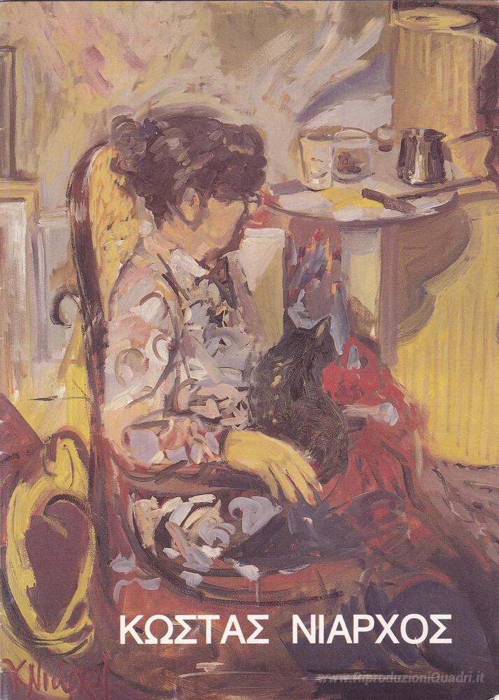Ti offriamo una riproduzione artigianale su tela dell'opera famosa 'Ritratto di una donna con il gatto nero' di Costas Niarchos, dal Museo delle Riproduzioni.