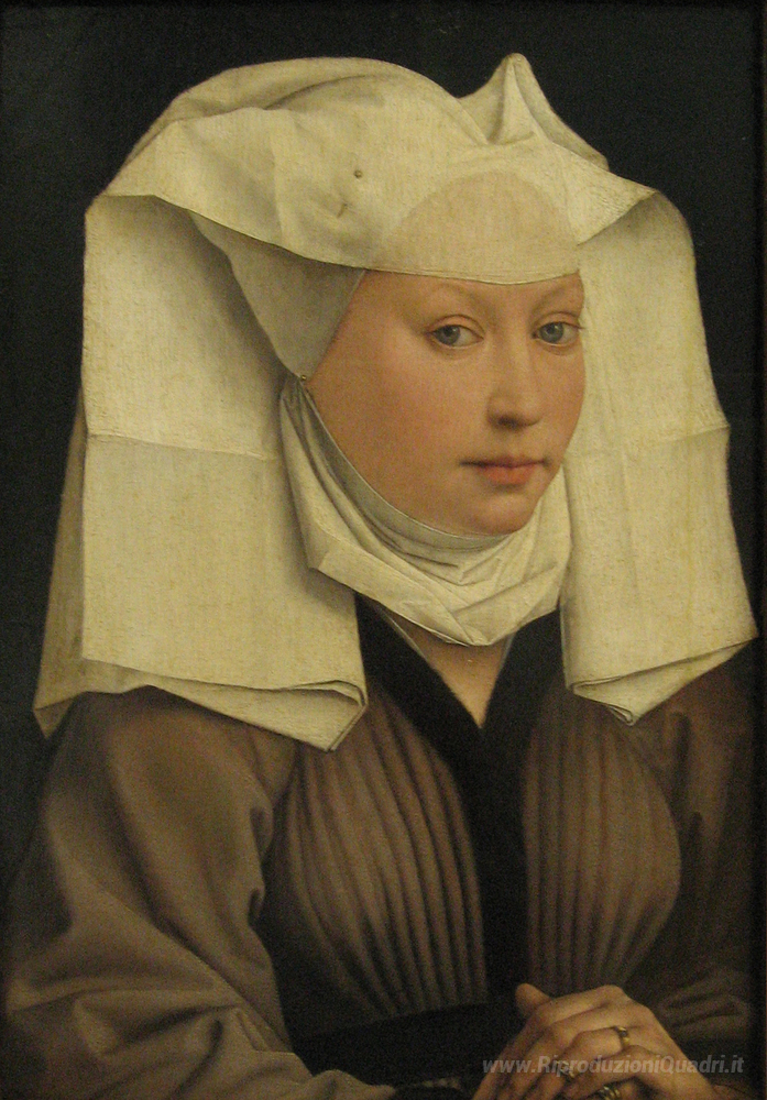 Ti offriamo una riproduzione artigianale su tela dell'opera famosa 'Ritratto di una giovane donna in un cappello Pinned' di Rogier van der Weyden, dal Museo delle Riproduzioni.