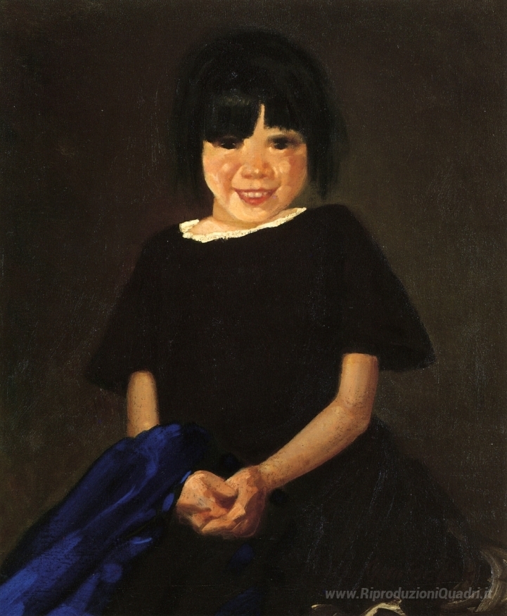 Ti offriamo una riproduzione artigianale su tela dell'opera famosa 'Ritratto di una ragazza in nero' di George Luks, dal Museo delle Riproduzioni.