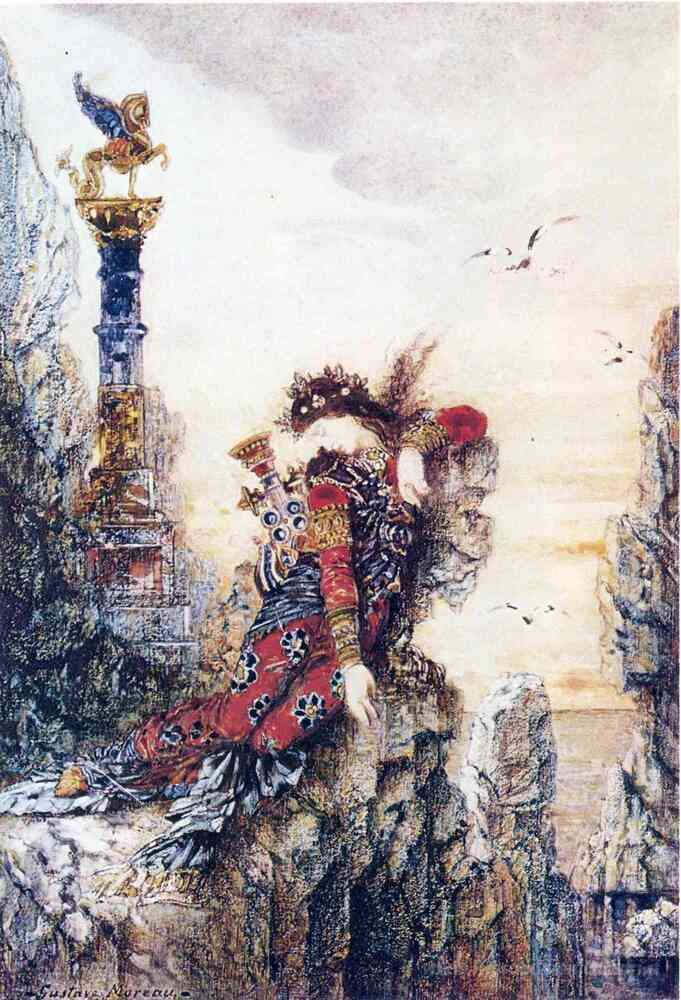 Ti offriamo una riproduzione artigianale su tela dell'opera famosa 'Saffo on the Rocks' di Gustave Moreau, dal Museo delle Riproduzioni.
