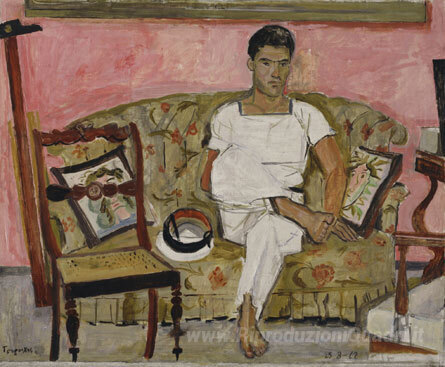Ti offriamo una riproduzione artigianale su tela dell'opera famosa 'Sailor senza scarpe, seduto sul divano' di Yiannis Tsaroychis, dal Museo delle Riproduzioni.