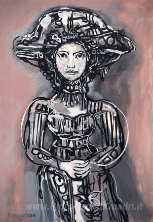 Ti offriamo una riproduzione artigianale su tela dell'opera famosa 'Signora con cappello in grigio-rosa Sfondo' di Rene Portocarrero, dal Museo delle Riproduzioni.