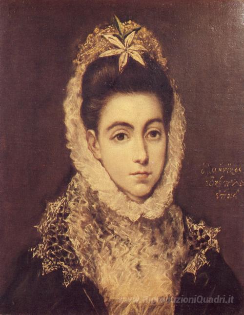 Ti offriamo una riproduzione artigianale su tela dell'opera famosa 'Signora con un fiore tra i capelli' di El Greco, dal Museo delle Riproduzioni.