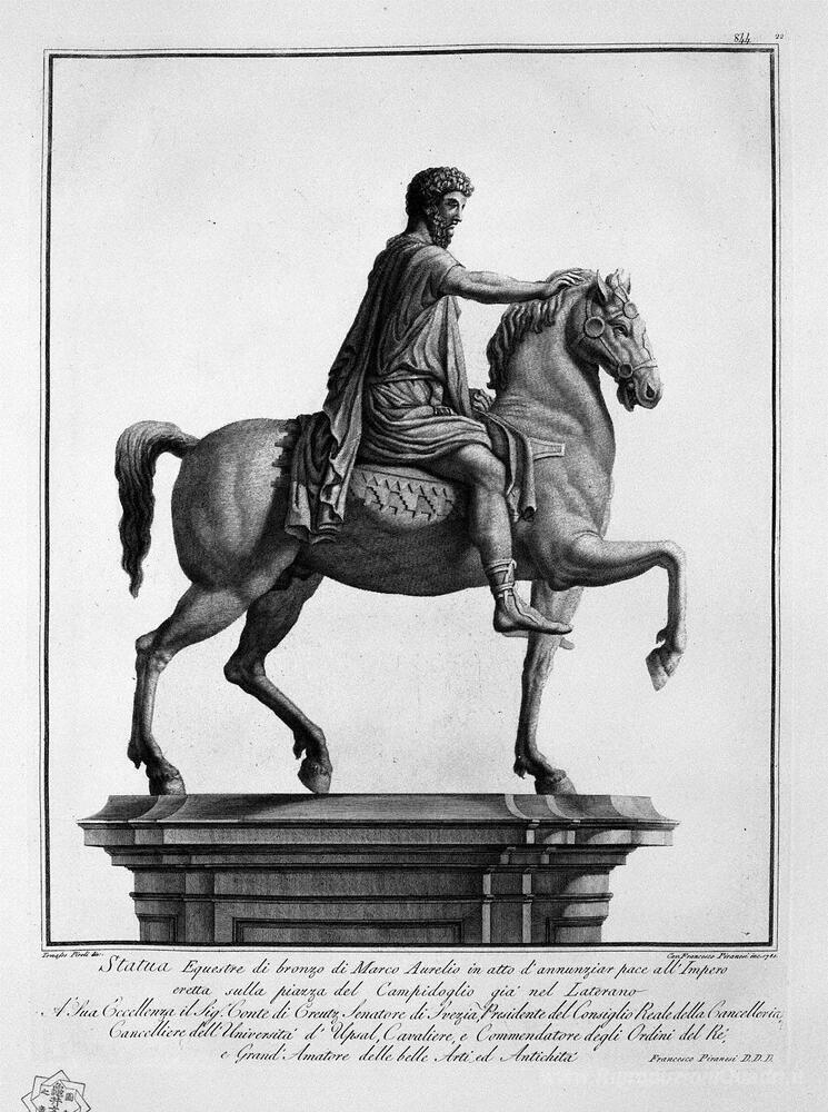 Ti offriamo una riproduzione artigianale su tela dell'opera famosa 'Statua equestre di Marco Aurelio' di Giovanni Battista Piranesi, dal Museo delle Riproduzioni.