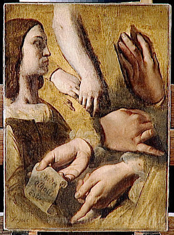 Ti offriamo una riproduzione artigianale su tela dell'opera famosa 'Studio per l'Apoteosi di Omero del profilo mani Raffaello di Ape' di Jean Auguste Dominique Ingres, dal Museo delle Riproduzioni.