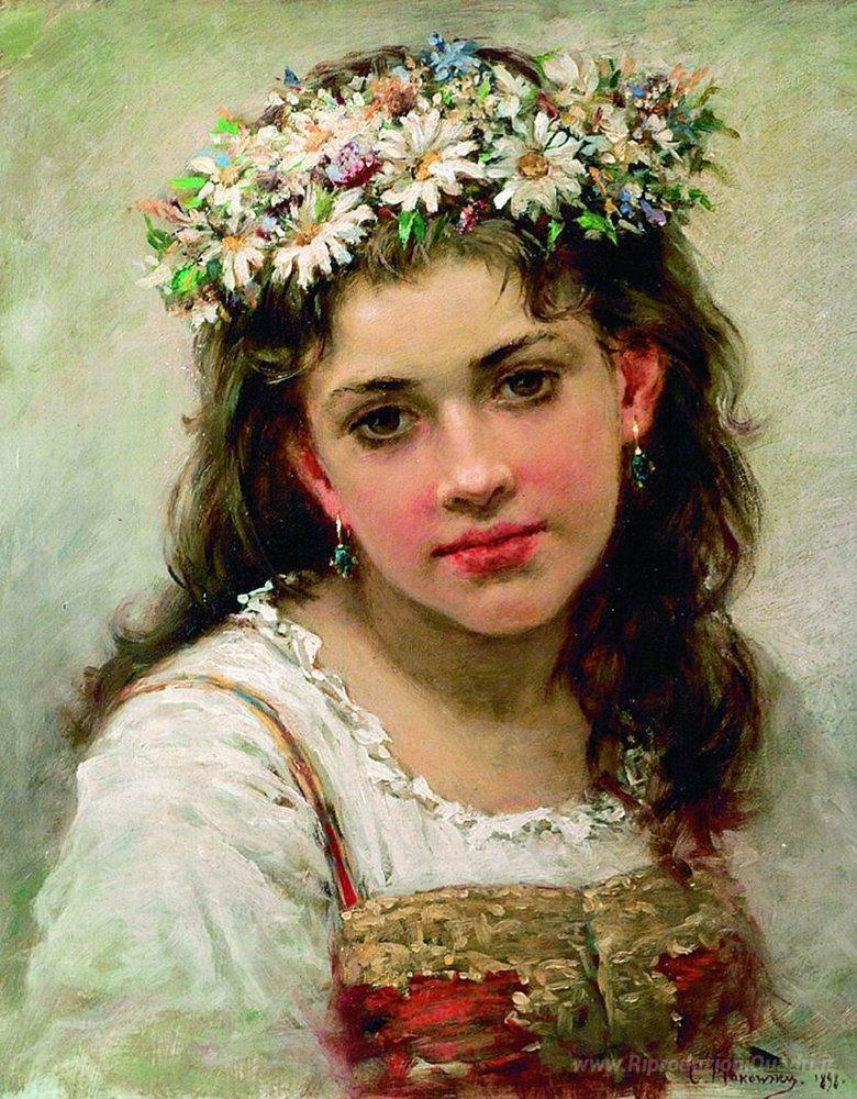 Ti offriamo una riproduzione artigianale su tela dell'opera famosa 'Testa della ragazza' di Konstantin Makovsky, dal Museo delle Riproduzioni.