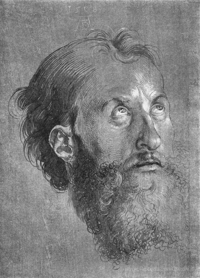 Ti offriamo una riproduzione artigianale su tela dell'opera famosa 'Testa di Apostolo Guardando verso l'alto' di Albrecht Durer, dal Museo delle Riproduzioni.