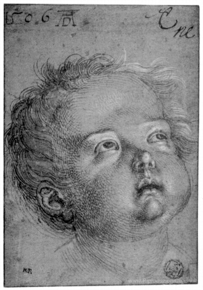 Ti offriamo una riproduzione artigianale su tela dell'opera famosa 'Testa di Bambino' di Albrecht Durer, dal Museo delle Riproduzioni.
