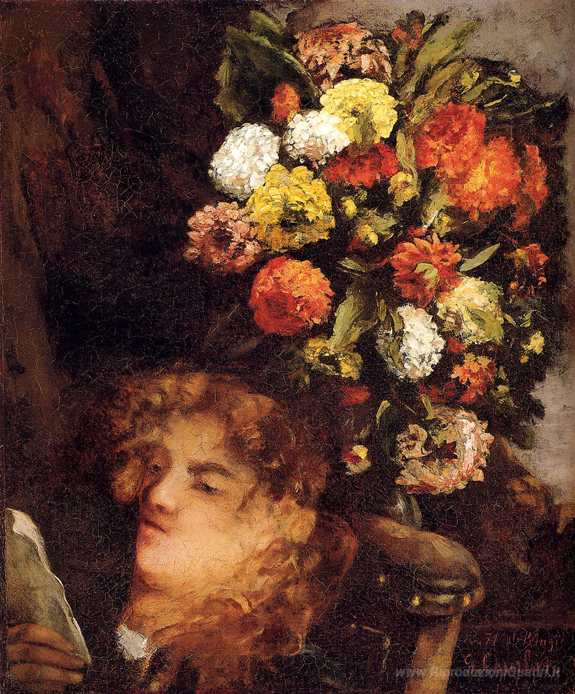 Ti offriamo una riproduzione artigianale su tela dell'opera famosa 'Testa di donna con fiori' di Gustave Courbet, dal Museo delle Riproduzioni.