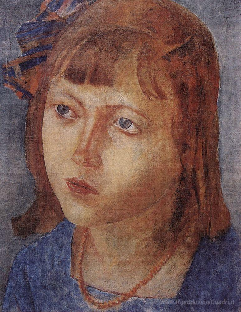Ti offriamo una riproduzione artigianale su tela dell'opera famosa 'Testa di ragazza' di Kuzma Petrov-Vodkin, dal Museo delle Riproduzioni.