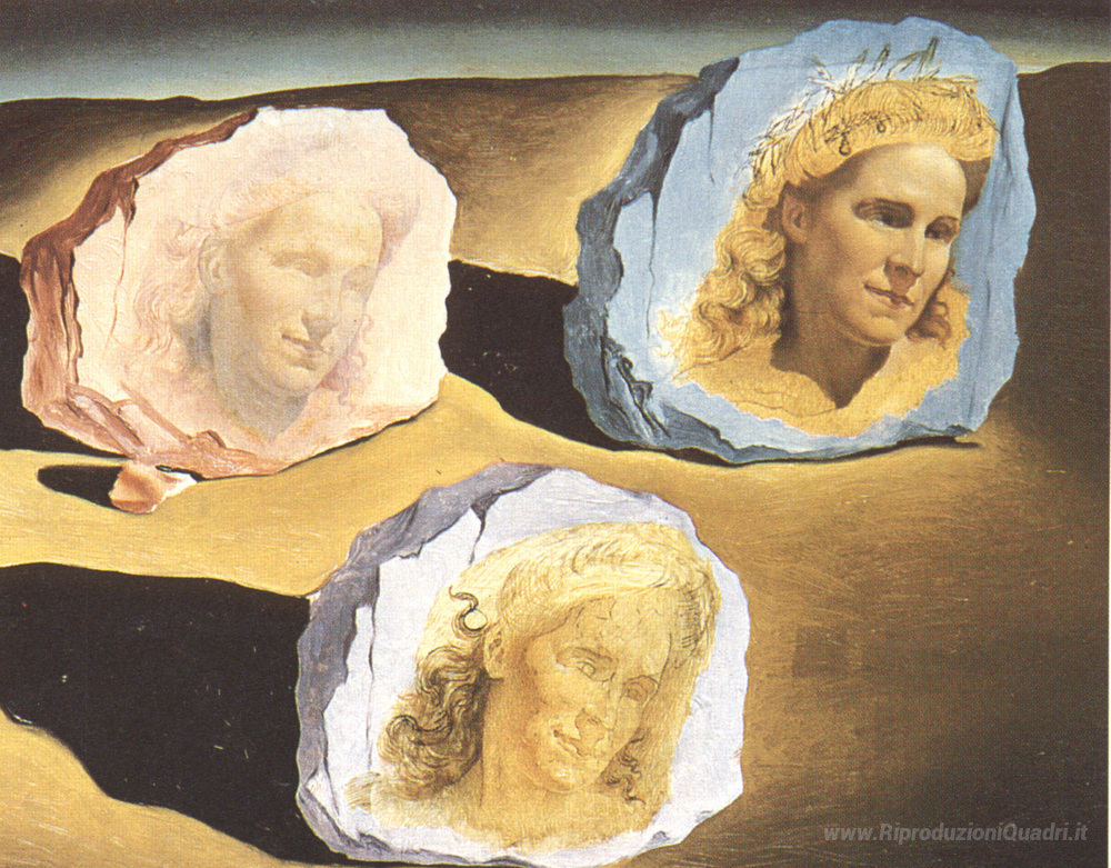 Ti offriamo una riproduzione artigianale su tela dell'opera famosa 'Tre Apparizioni della Visage di Gala' di Salvador Dali, dal Museo delle Riproduzioni.