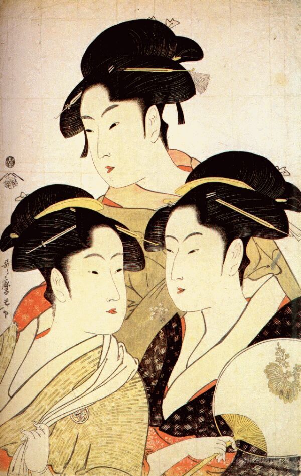 Ti offriamo una riproduzione artigianale su tela dell'opera famosa 'Tre bellezze del giorno presente' di Kitagawa Utamaro, dal Museo delle Riproduzioni.