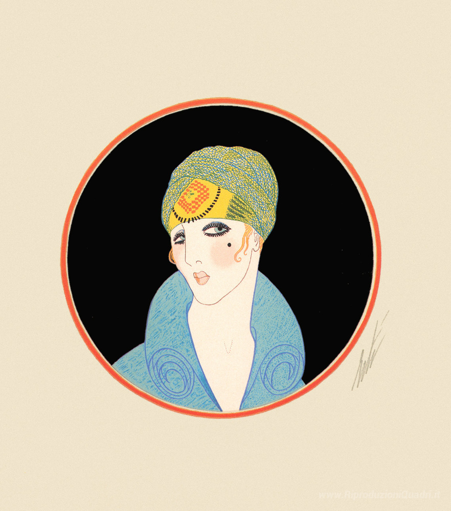 Ti offriamo una riproduzione artigianale su tela dell'opera famosa 'Turbante Giallo' di Erte, dal Museo delle Riproduzioni.