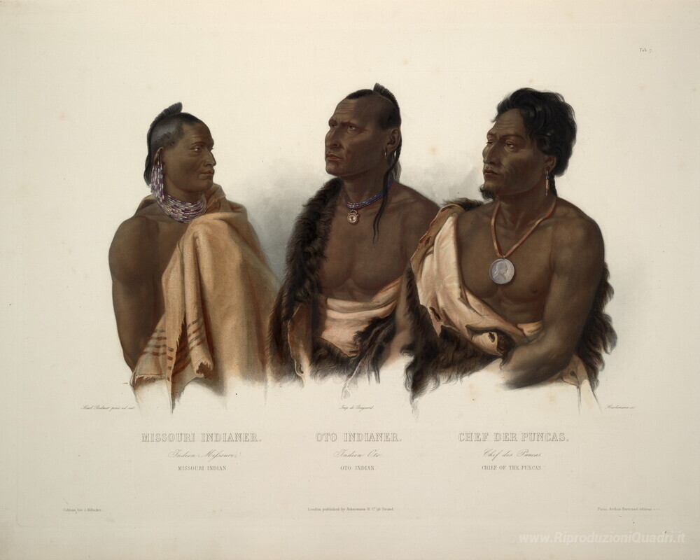 Ti offriamo una riproduzione artigianale su tela dell'opera famosa 'Un Missouri indiano, un Oto indiano e il capo della Puncas, piat' di Karl Bodmer, dal Museo delle Riproduzioni.