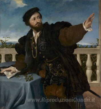 Ti offriamo una riproduzione artigianale su tela dell'opera famosa 'Un nobile su un balcone' di Lorenzo Lotto, dal Museo delle Riproduzioni.