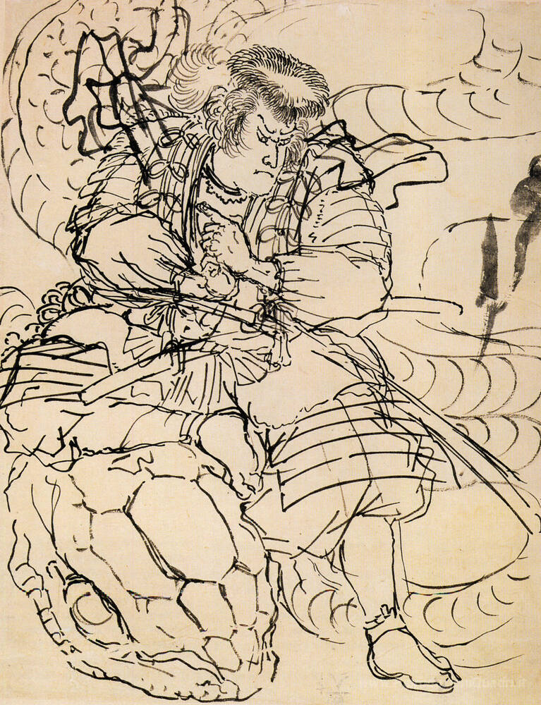 Ti offriamo una riproduzione artigianale su tela dell'opera famosa 'Un samurai travolgendo un serpente gigante' di Utagawa Kuniyoshi, dal Museo delle Riproduzioni.