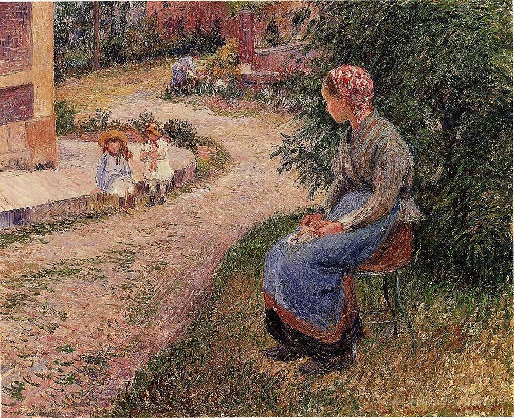 Ti offriamo una riproduzione artigianale su tela dell'opera famosa 'Un servo Seduti nel giardino a Eragny' di Camille Pissarro, dal Museo delle Riproduzioni.