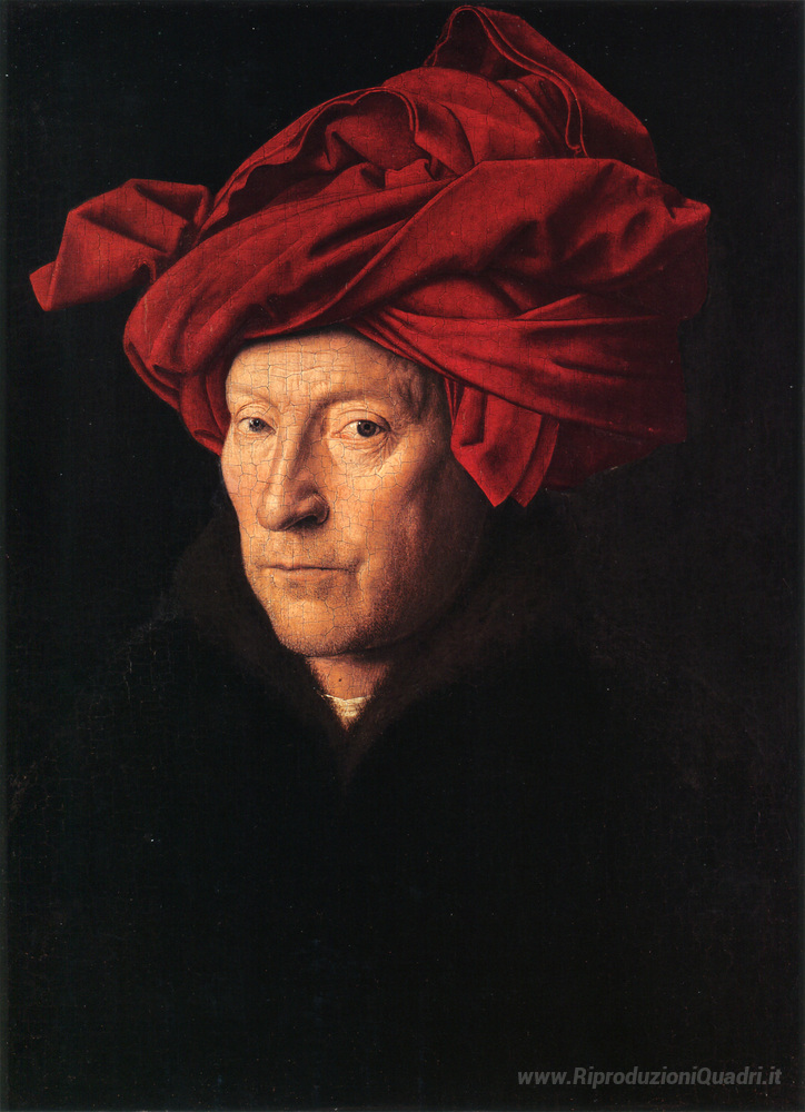 Ti offriamo una riproduzione artigianale su tela dell'opera famosa 'Un uomo in un turbante' di Jan van Eyck, dal Museo delle Riproduzioni.