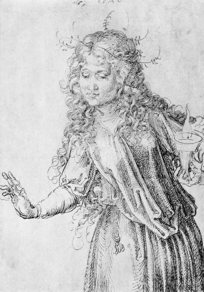 Ti offriamo una riproduzione artigianale su tela dell'opera famosa 'Una delle vergini sagge' di Albrecht Durer, dal Museo delle Riproduzioni.